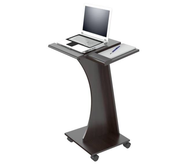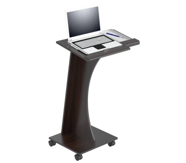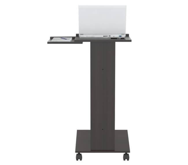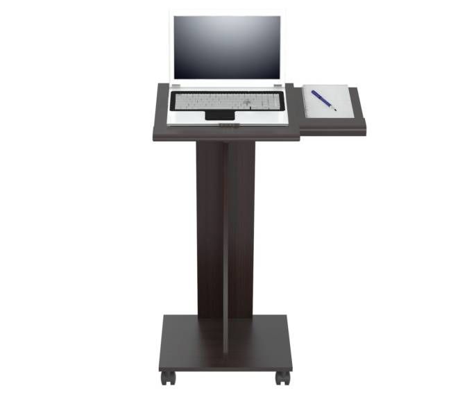Rolling laptop cart, with four (4) wheels for easy mobility, wheels comes with lock to secure in place. Can be assembled to be used with mouse on left or right surface, two (2) separate work surfaces. Laminated in double-faced durable melamine which is stained, heat and scratch resistant, finished in Espresso-Wengue, solid engineered wood