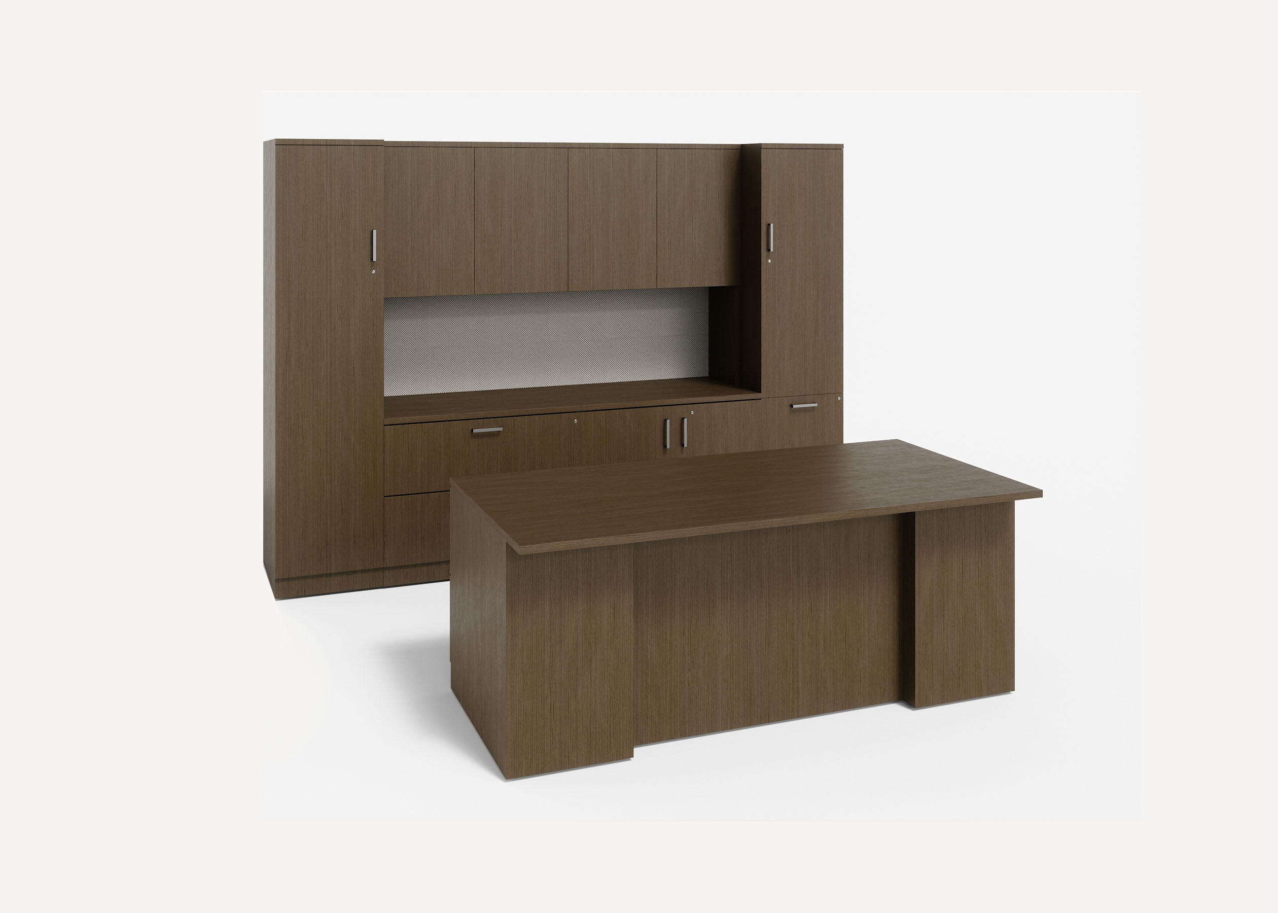 NOVELLE desks feature an elegantly recessed back panel available in laminate or glazed. Glazed back panels feature a framed exterior with a frosted glazed interior.