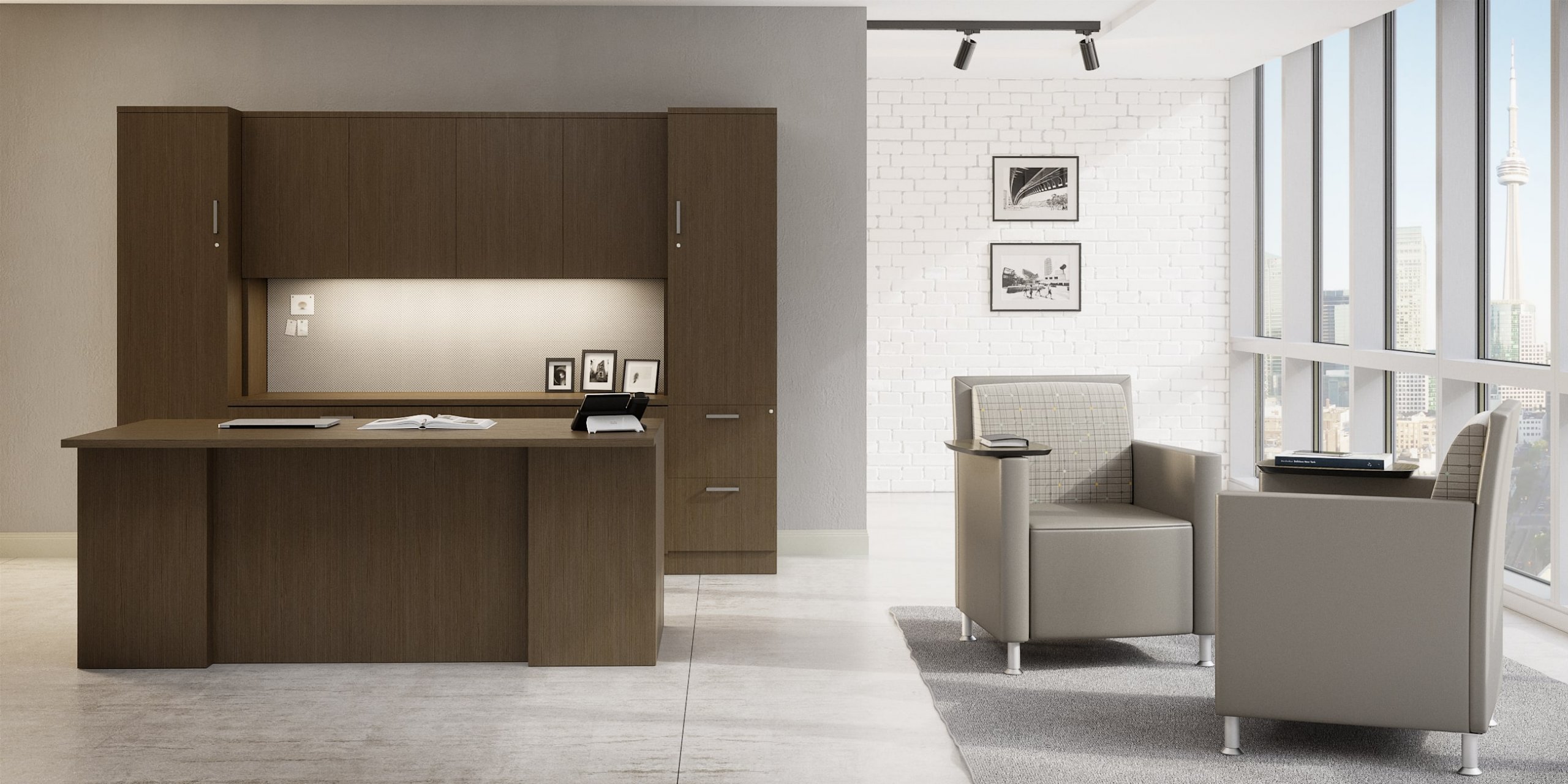 NOVELLE desks feature an elegantly recessed back panel available in laminate or glazed. Glazed back panels feature a framed exterior with a frosted glazed interior.