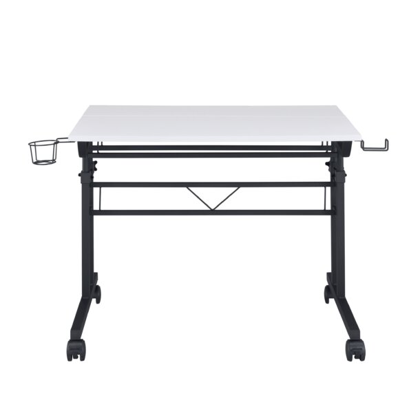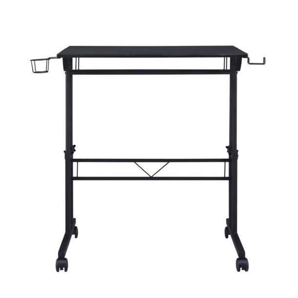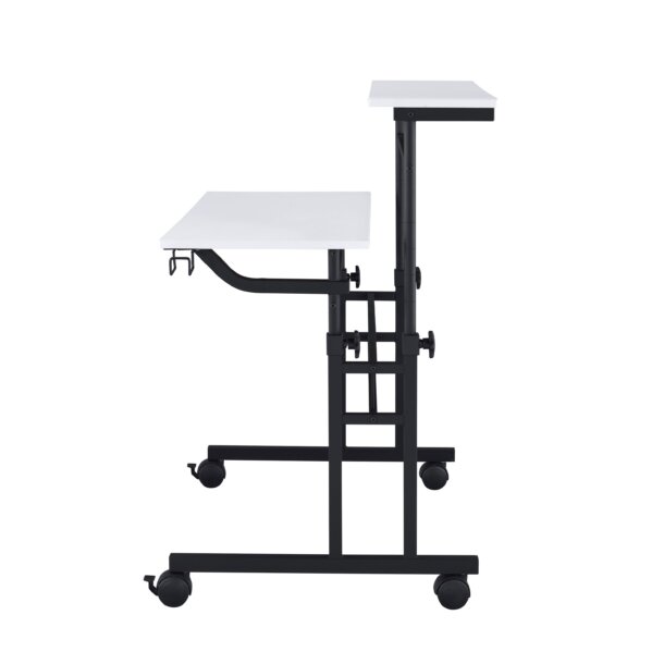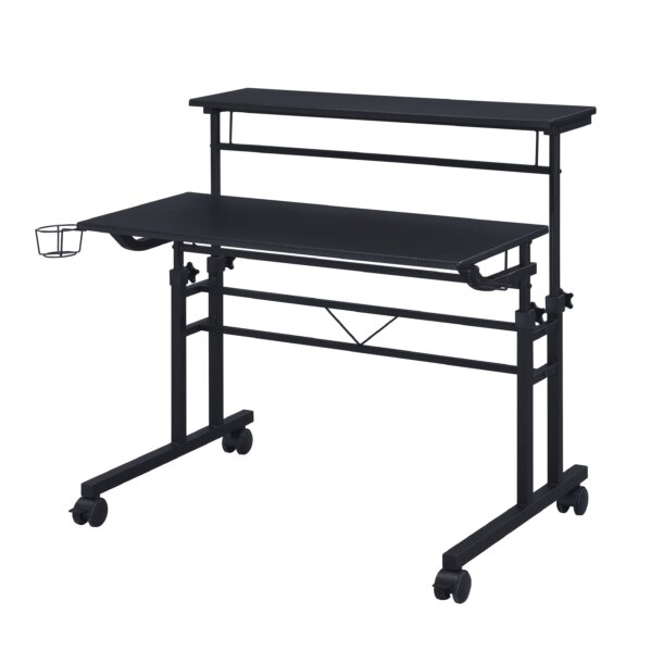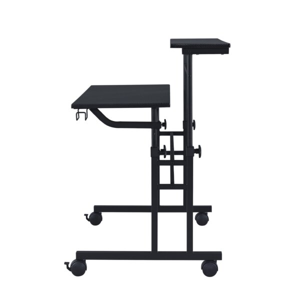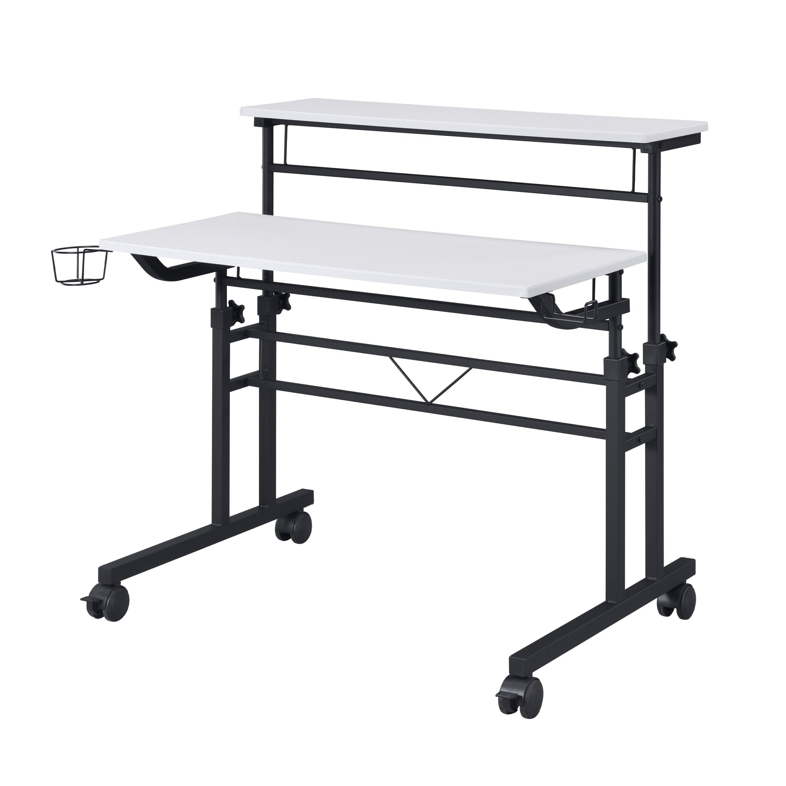 Mix industrial and modern styles together with this Rolling and Adjustable Writing Desk. This desk is perfect for home-office spaces with its small footprint and offers the option of 2 separate desktops independent levels with ample space that includes an adjustable height mechanism. The finish coordinates with almost any decor while carbon fiber-like texture tabletop surface and powder-coated metal frame and legs that give this desk a sturdy build along with a fun design. It includes front wheels with a locking mechanism that lets you swiftly glide in a home office space. The desktop is large enough to hold your laptop, notebooks, and office essentials while the other tabletop surface can be used as a riser to keep items within reach. It comes with integrated headphones and cup holders that can be easily installed on right and left. It is easy to assemble and comes with a 5-year limited warranty. Color: Black and White.