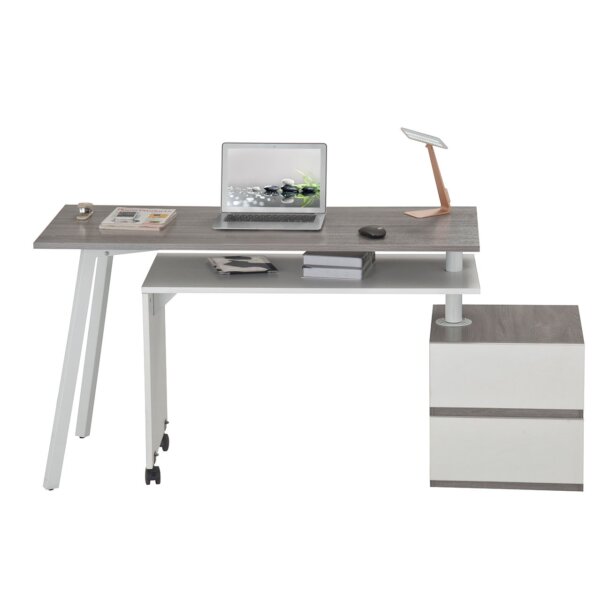 This Modern Rotating Workstation offers just the right amount of desktop space needed for every task. Its unique design of a rolling caster-equipped side table pivots around a two-drawer cabinet. Customize the table to an L-Shape for corner areas, extend it for a wider surface or close it for tighter spots. This space-saving nested desk is made of MDF panels with a moisture-resistant PVC laminate surface, supported by sturdy legs of powder-coated steel. This L-Shape desk is fully reversible left or right-hand. Color: Grey