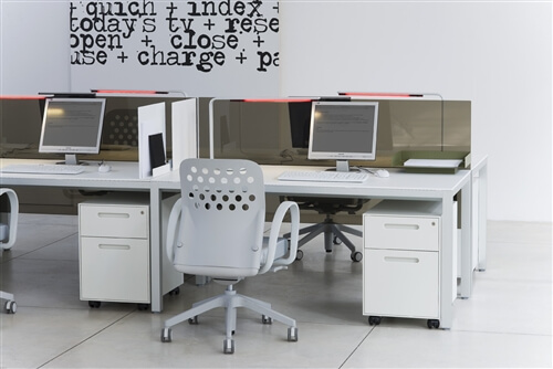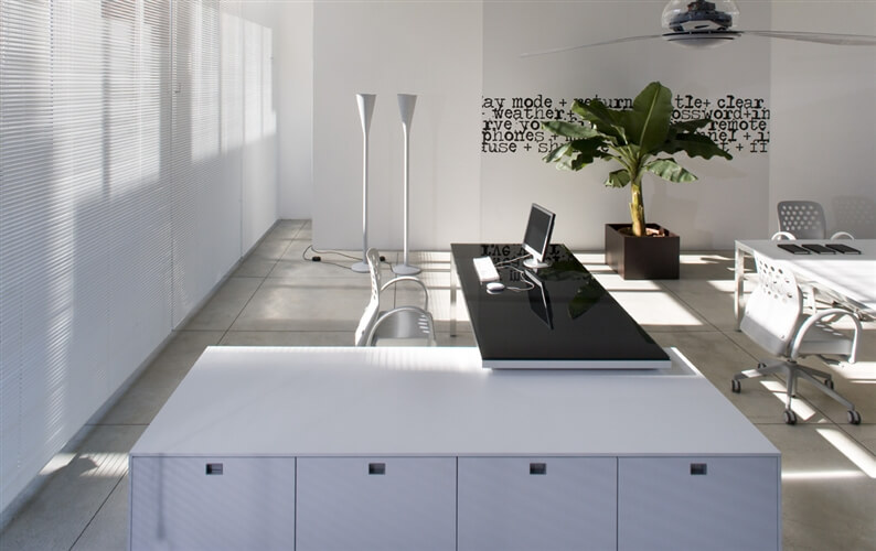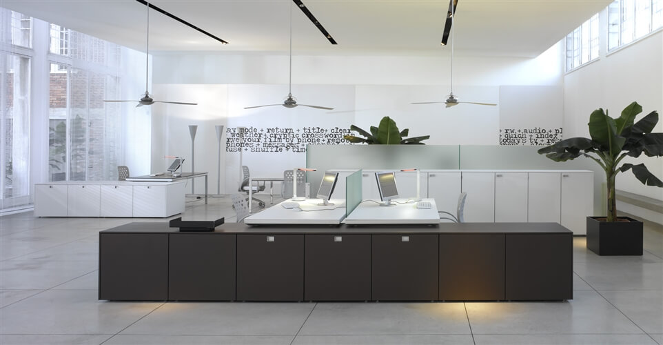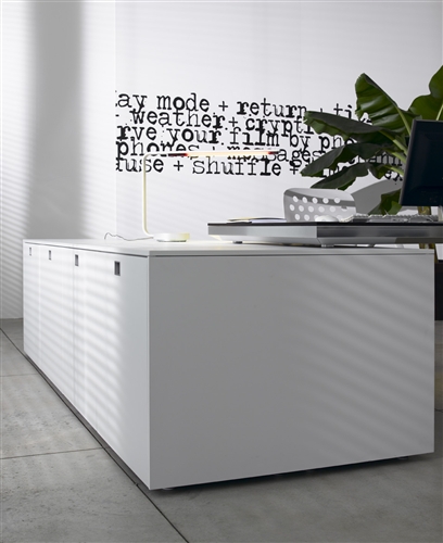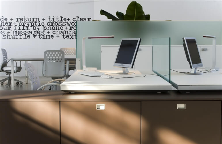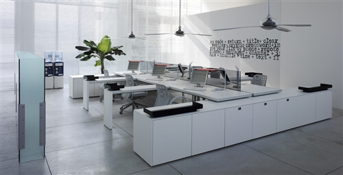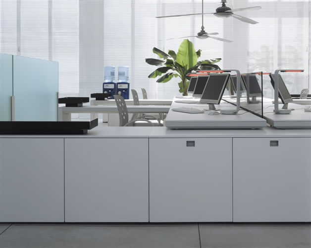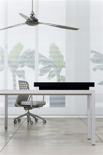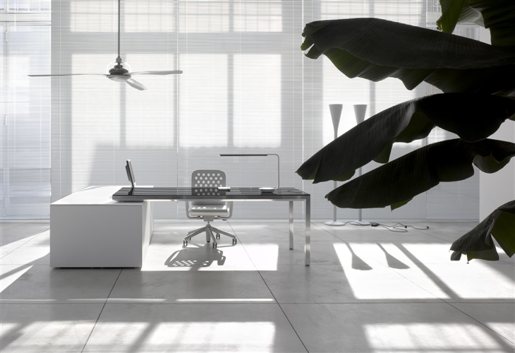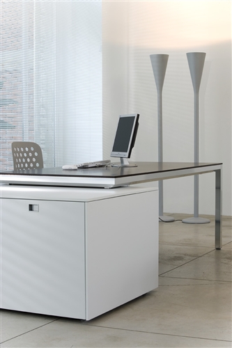 A linear system characterized by a perimetral aluminum structure supporting the tops that enhances its elegance and functionality. Single desk, bench or executive workstations can be created with design freedom and a wide choice of finishes and materials. Dividing screens allow to separate the workstations; lacquered or paint- finished metal drawers complete the panorama of accessories.