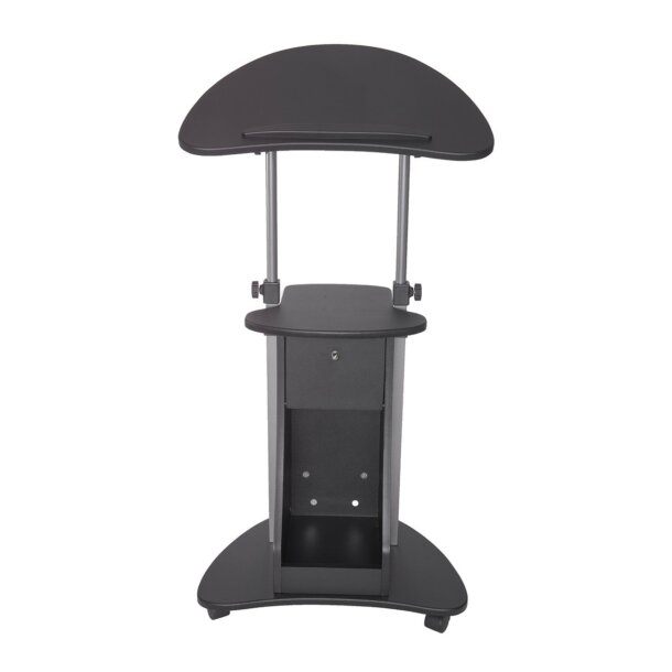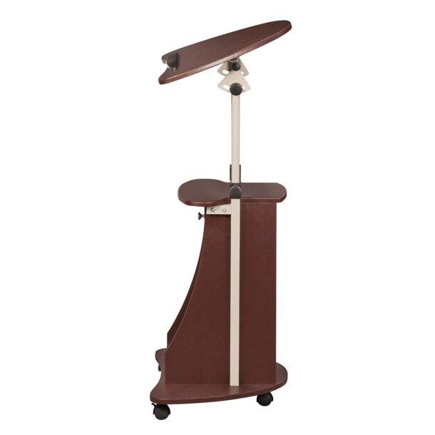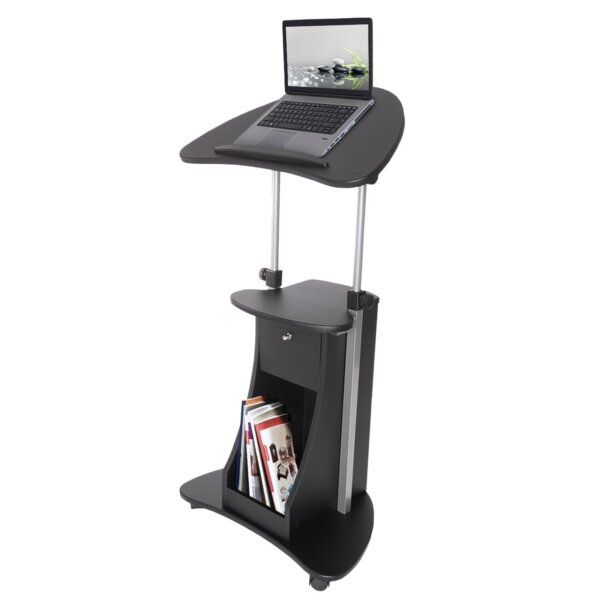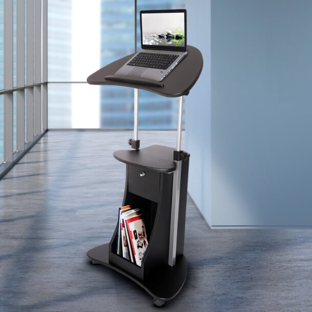 The Deluxe Sit-to-Stand Rolling Laptop Cart with Storage saves space while providing the laptop or writing setup you need. The table panel tilts so you can adjust it to the most ergonomic, comfortable working angle. It also features a safety edge-stopper to prevent objects from sliding off when tilted. You can easily adjust the table height between 31.5 and 45.5 inches with dual adjustment knobs. There are an open storage compartment and a closed storage compartment with bottom hinges. Two of the four non-marking nylon casters include locking mechanisms. The table and closed storage top and bottom shelves each have a 20 Lbs weight capacity and the base of the cart has a 30 Lbs weight capacity and is made of MDF panels with a moisture laminate veneer atop a scratch-resistant powder-coated steel frame. Color: Black & Chocolate.