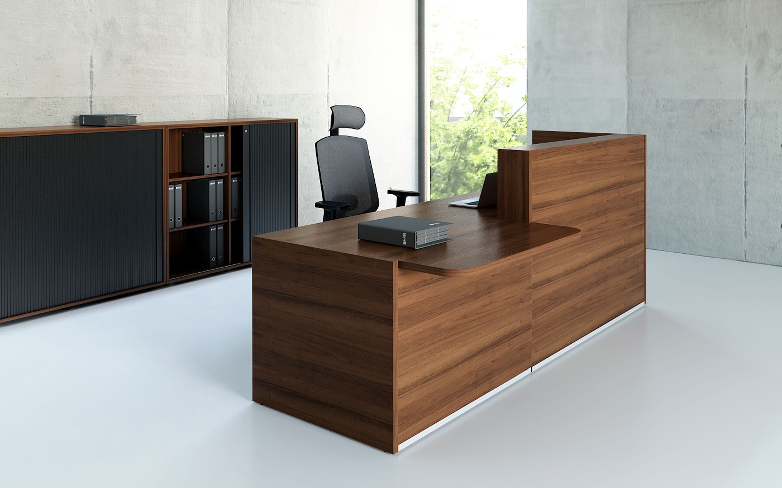 Reception desk Tera combines high gloss HPL elements with MFC in white, Canadian oak or nut. It is a modular solution allowing to create compatible or large reception counters depending on requirements. It comes with optional top highlighted with LED lighting.