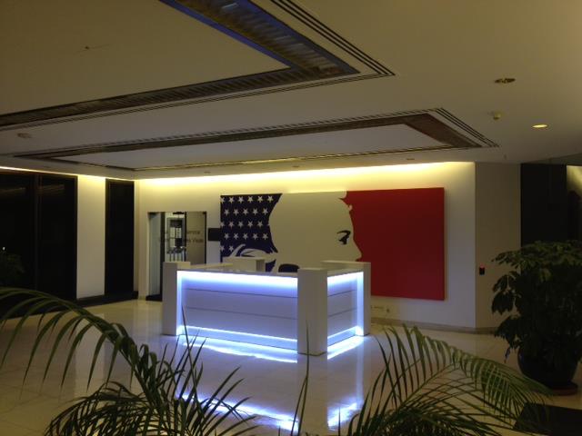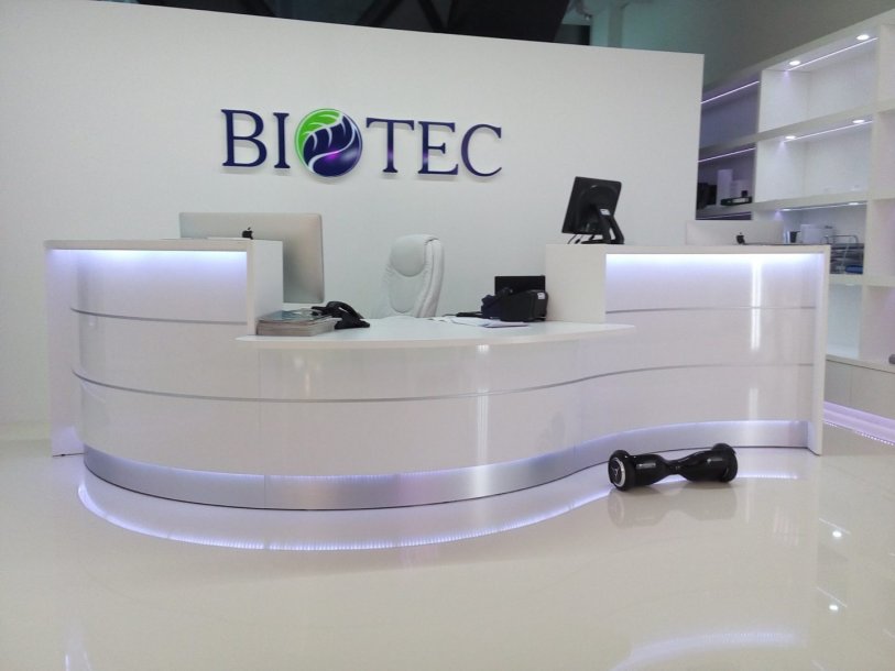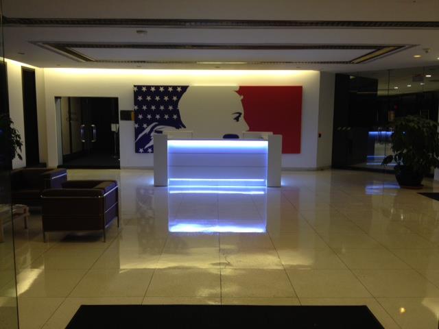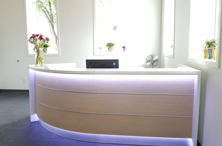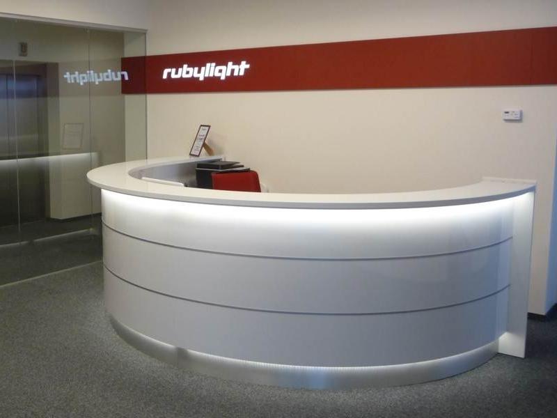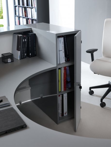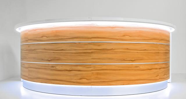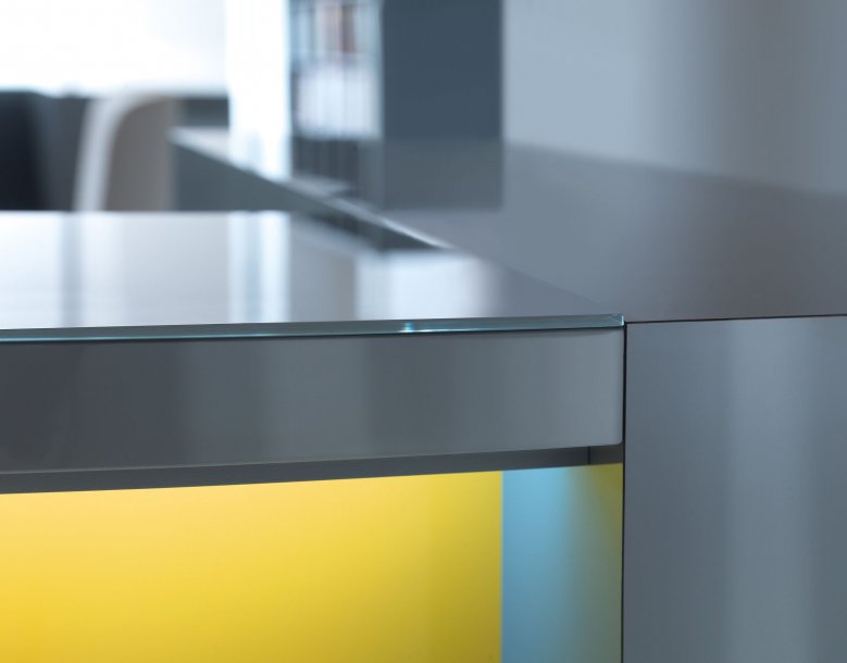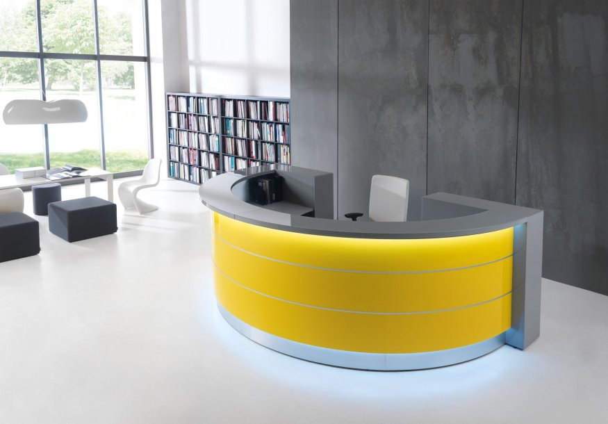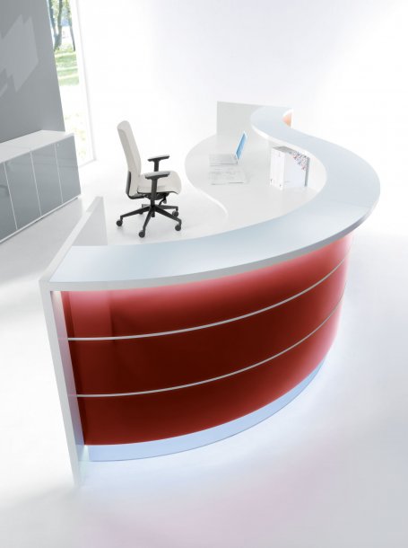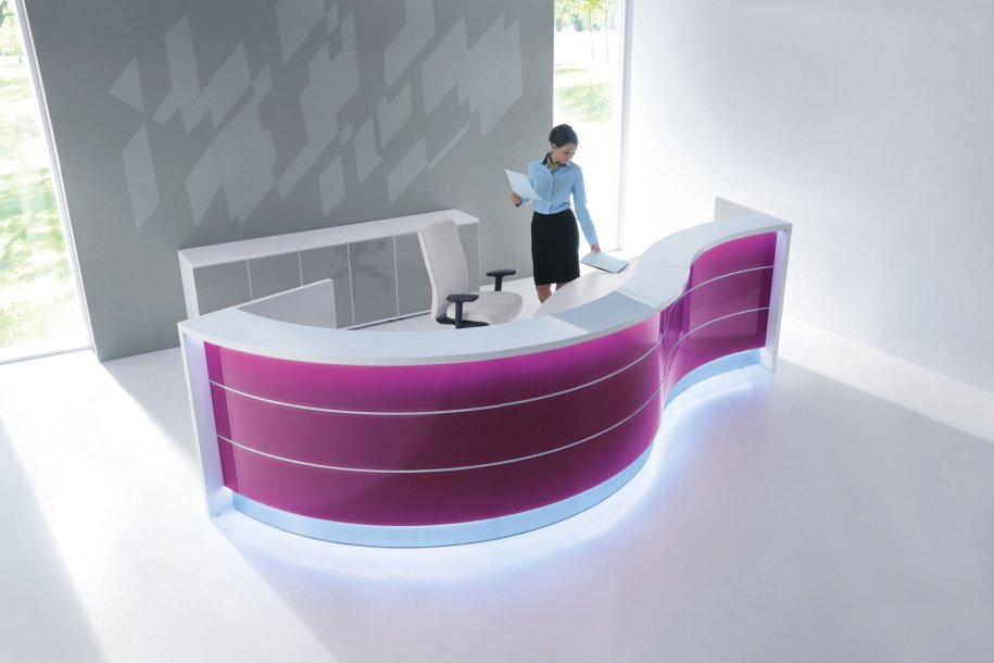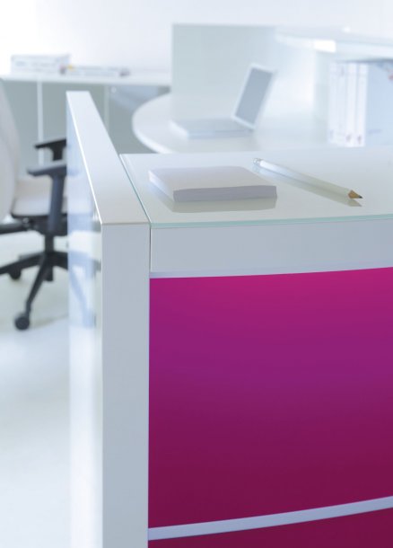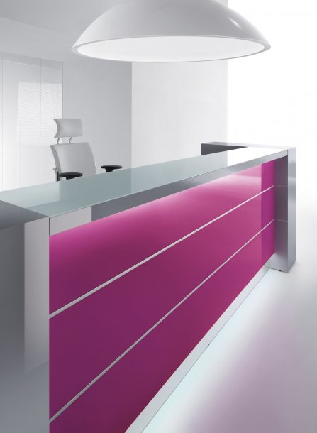 Straight, convex and concave elements are at your disposal in any of the numerous wavy, circular and upright arrangements, which perfectly create the feeling of style and integrity for the reception area. The high gloss facial surface is illuminated by the LED-lighting, and the selection of HPL and wood-colour fronts complements the accurate white body of the reception counter. Being a superb workspace, Valde also stands out for its creative design and cogent elegance emphasized by the precision of details. Horizontal slats made of aluminum emphasize a shape and a modern character of the body. The desk top made of tempered white glass perfectly matches the glittering frontal part of the counter. LED lighting located under the upper desk top and at the basis of the counter makes the reception desk presenting perfectly in darker rooms. Cool light perfectly harmonizes with whiteness while in case of a colorful front it emphasizes its color.