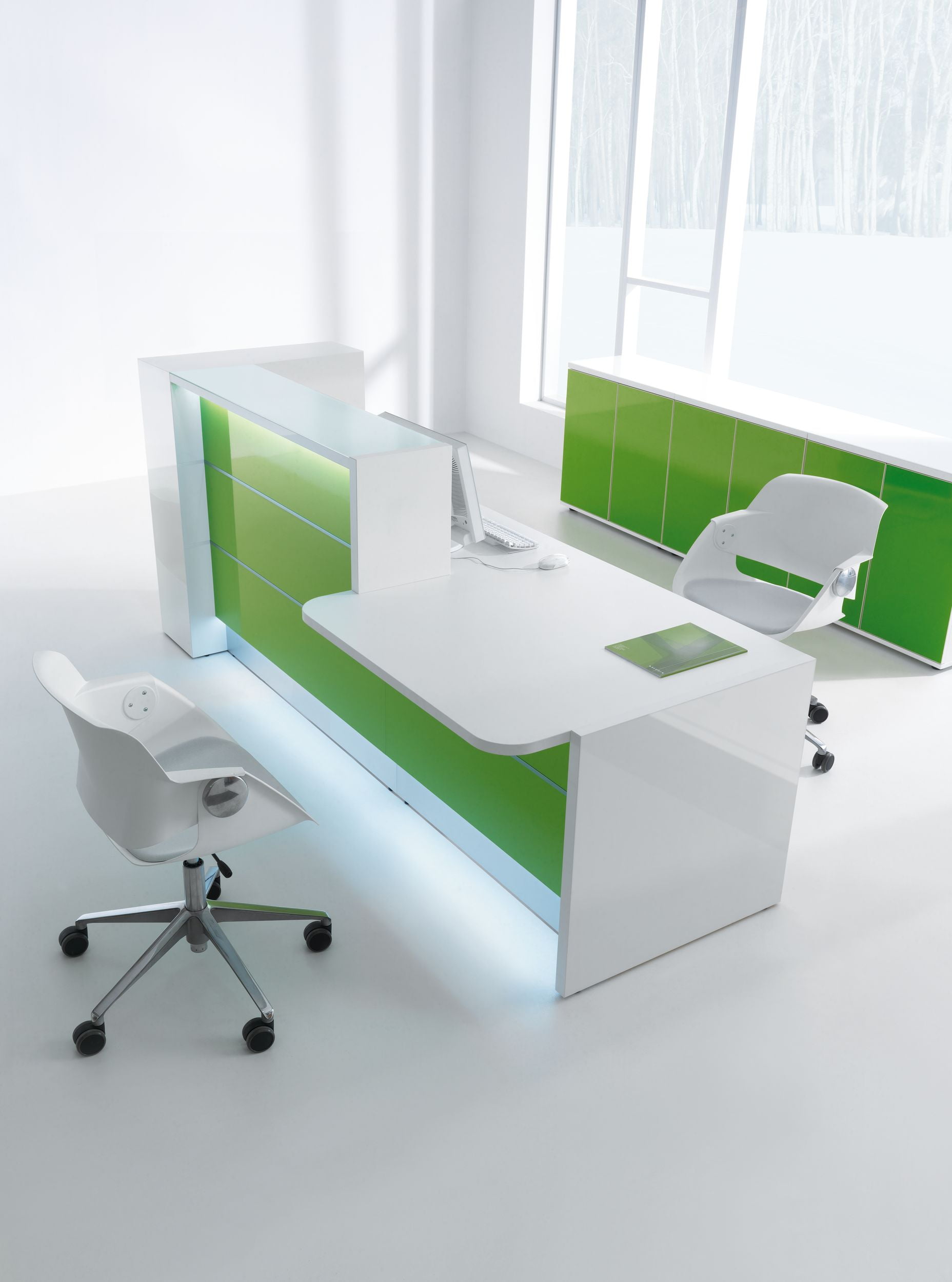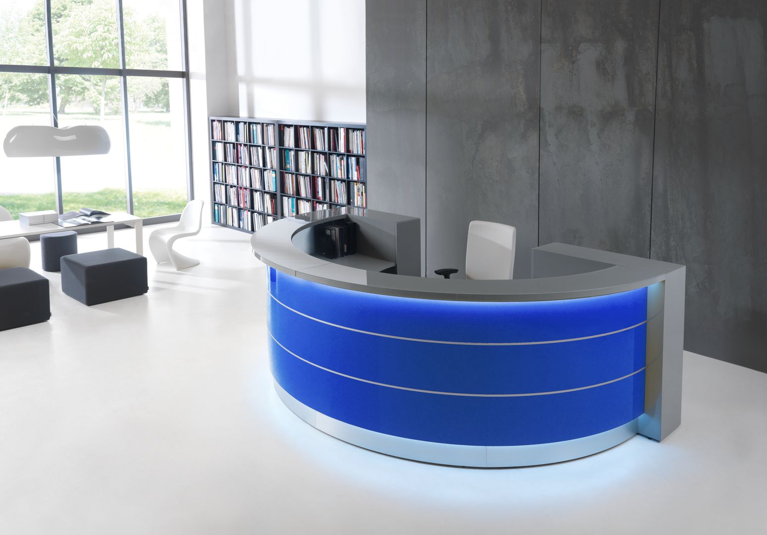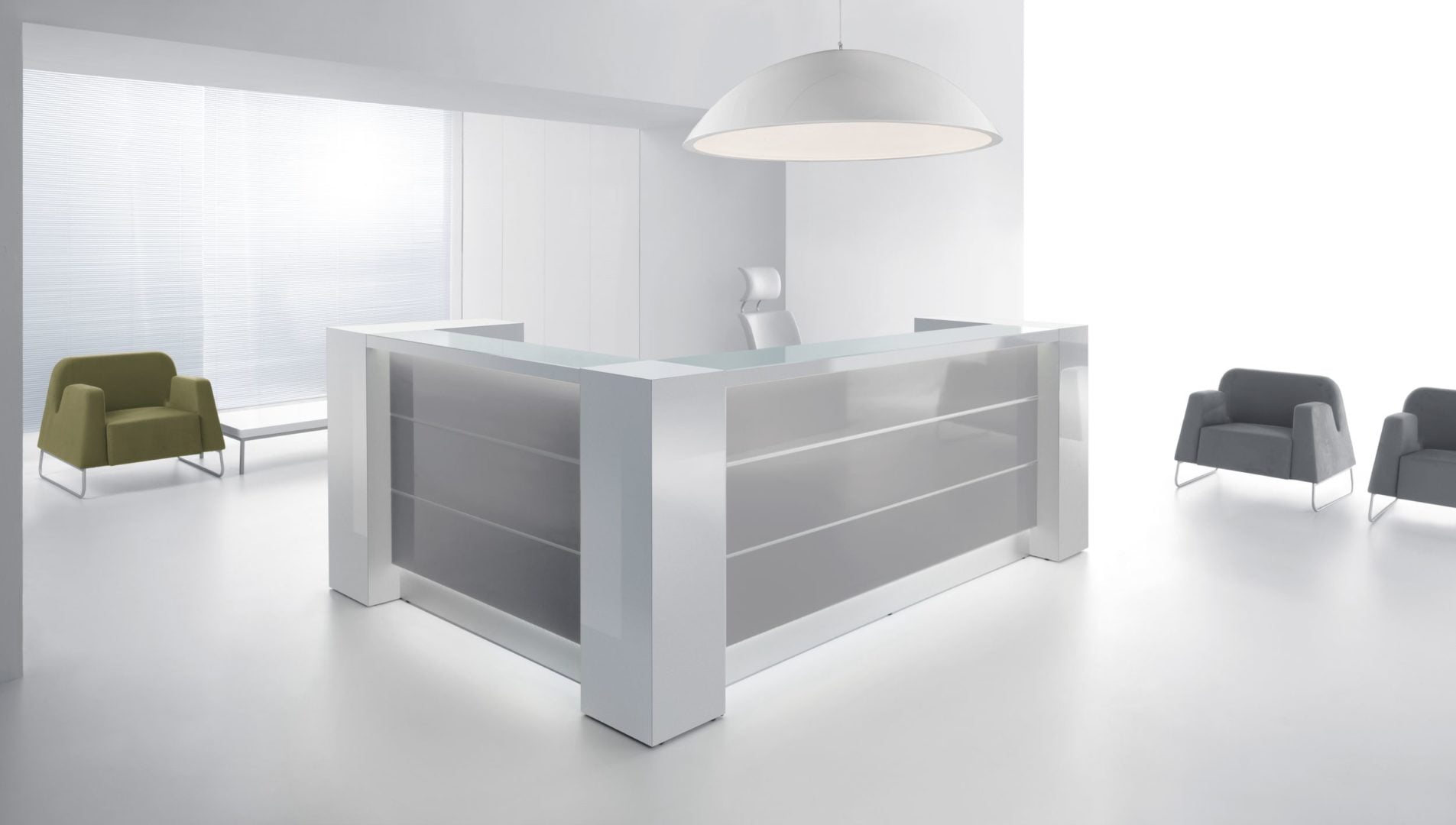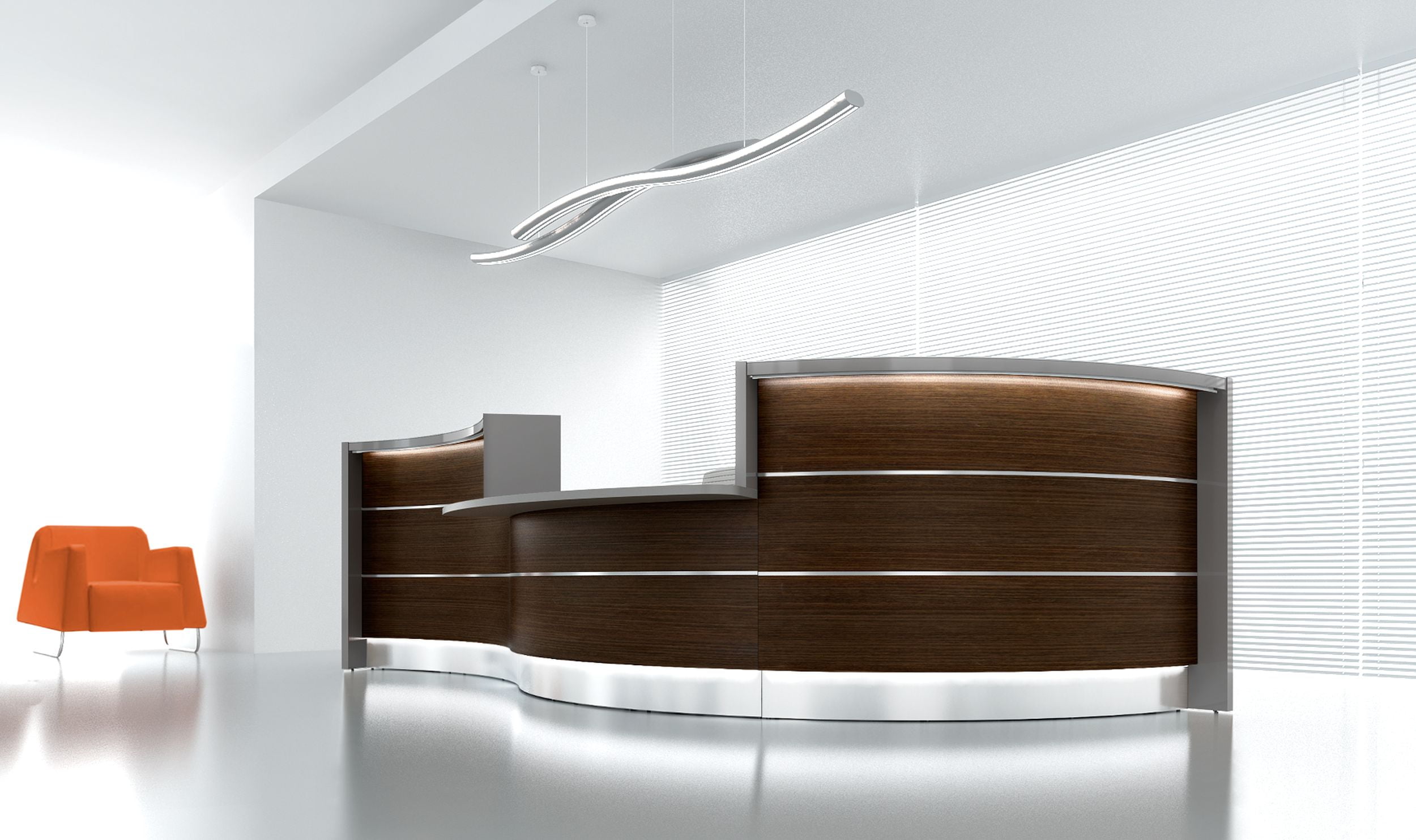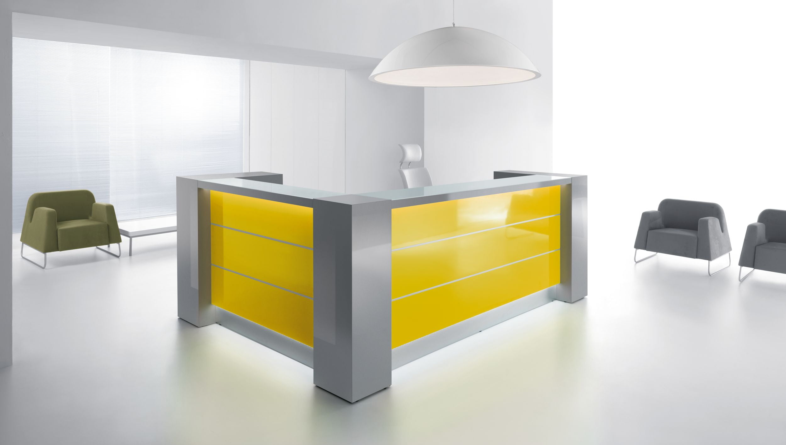 Straight, convex and concave elements are at your disposal in any of the numerous wavy, circular and upright arrangements, which perfectly create the feeling of style and integrity for the reception area. The high gloss facial surface is illuminated by the LED-lighting, and the selection of HPL and wood-colour fronts complements the accurate white body of the reception counter. Being a superb workspace, Valde also stands out for its creative design and cogent elegance emphasized by the precision of details. Horizontal slats made of aluminum emphasize a shape and a modern character of the body. The desk top made of tempered white glass perfectly matches the glittering frontal part of the counter. LED lighting located under the upper desk top and at the basis of the counter makes the reception desk presenting perfectly in darker rooms. Cool light perfectly harmonizes with whiteness while in case of a colorful front it emphasizes its color.