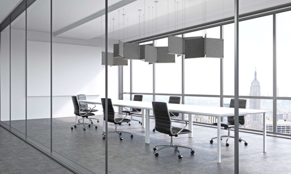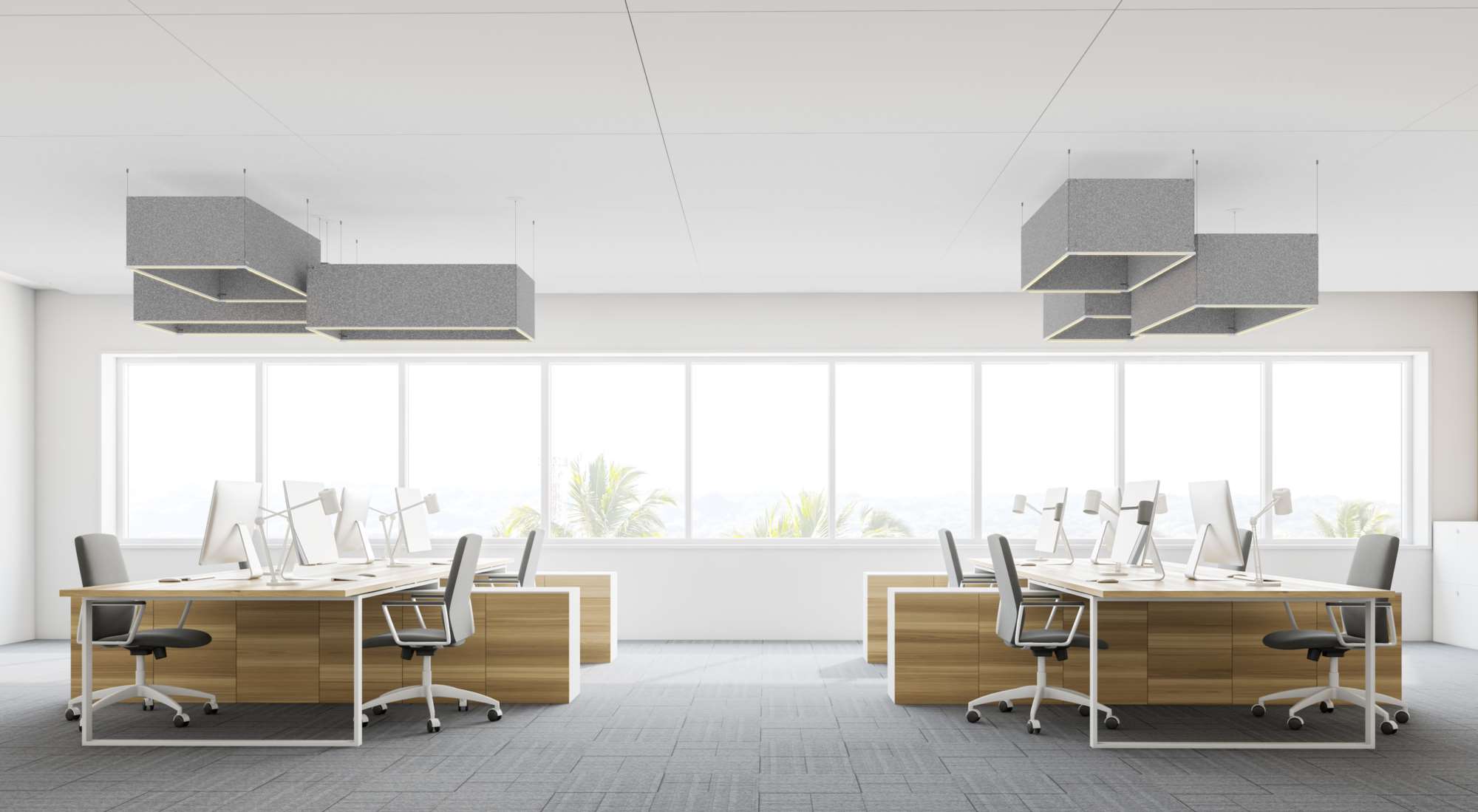 Koncept’s line of vertical acoustic panels are a sculptural solution to sound absorption. 15″ in height, panels are mounted along the suspending wires of compatible Z-Bar Pendant models.